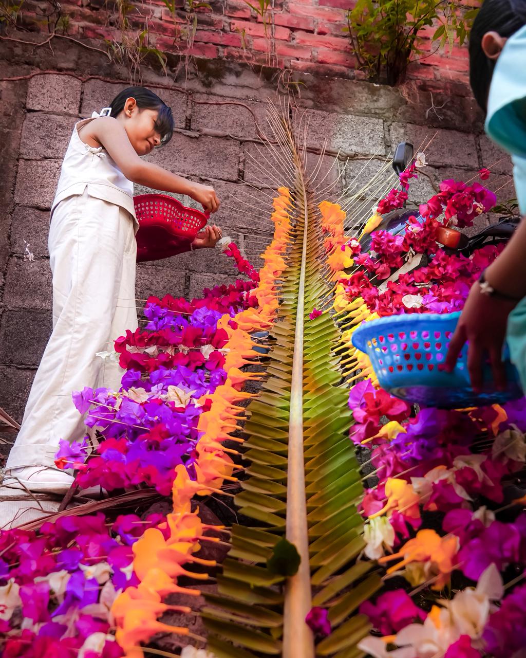 Las palmas se cortan con aproximadamente dos meses de anticipación y se dejan secar. Posteriormente, se realiza el raspado para formar las "pignas", que son las vainas listas para ensartar las flores.