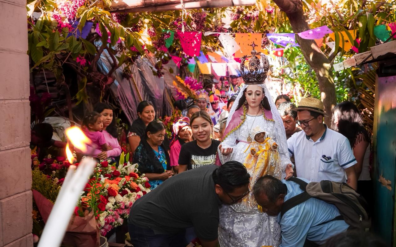 El "Teta" acude ante el sacerdote católico para solicitar el permiso de sacar de la iglesia las dos imágenes de la Virgen, que representan la advocación de la Inmaculada Concepción y la advocación de la Virgen del Rosario. Estas son colocadas en andas amorosamente adornadas con miles de flores y llevadas a los altares preparados con esmero y devoción en la casa de la mayordomía y en la casa de la capitanía donde pasan la noche siendo veneradas con cantos y oraciones.