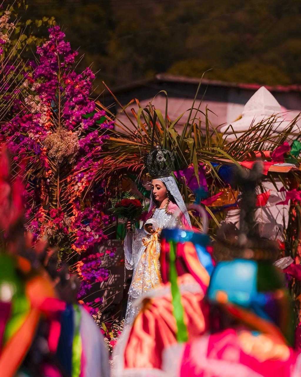 Desde allí, al día siguiente, las imágenes salen en procesión por las estrechas calles del pueblo, acompañadas de danzas tradicionales ejecutada por los Chapetones y los Historiantes, así como de la música del pito y el tambor.